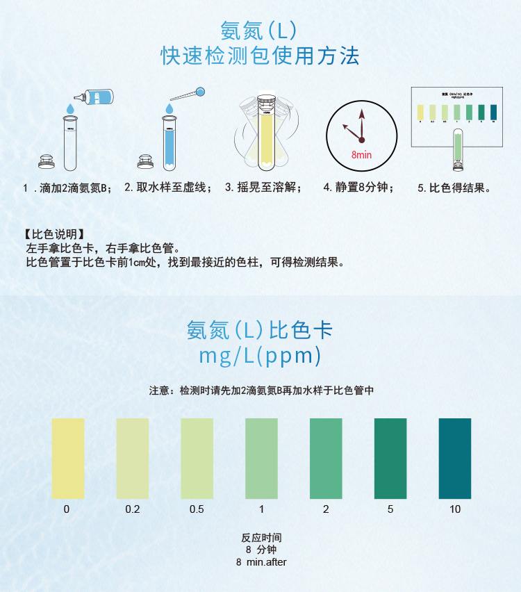 2.本產(chǎn)品檢測(cè)水中游離態(tài)的氨(NH3)或銨離子(NH4+)含量在0-10mg/L(ppm)范圍內(nèi),若要檢測(cè)10mg/L以上濃度水樣,請(qǐng)預(yù)先稀釋水樣后再進(jìn)行測(cè)定,具體操作見稀釋說明書。