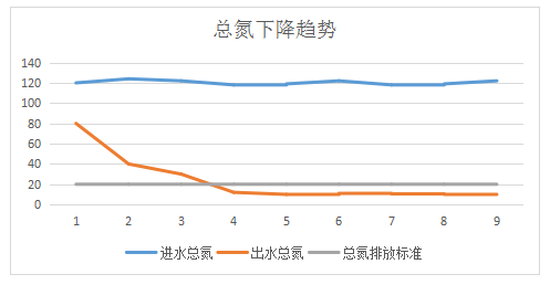 采用庫(kù)巴魯生化修復(fù)方案后,出水總氮由80mg/L持續(xù)下降,最終穩(wěn)定出水TN在10mg/L左右,達(dá)到一級(jí)B排放標(biāo)準(zhǔn)。